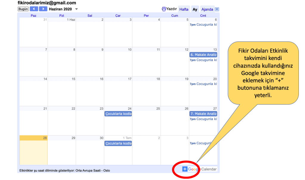 Fikir Odaları bünyesinde düzenli olarak Makale Analizi, Çocuklarla Birlikte Kitap Okuma ve Çocuklar İçin Kodlama Eğitimleri yapılmaktadır. Bu ve benzeri etkinliklerimizden haberdar olmak için Fikir Odaları google takvimini kendi takviminize ekleyebilirsiniz.